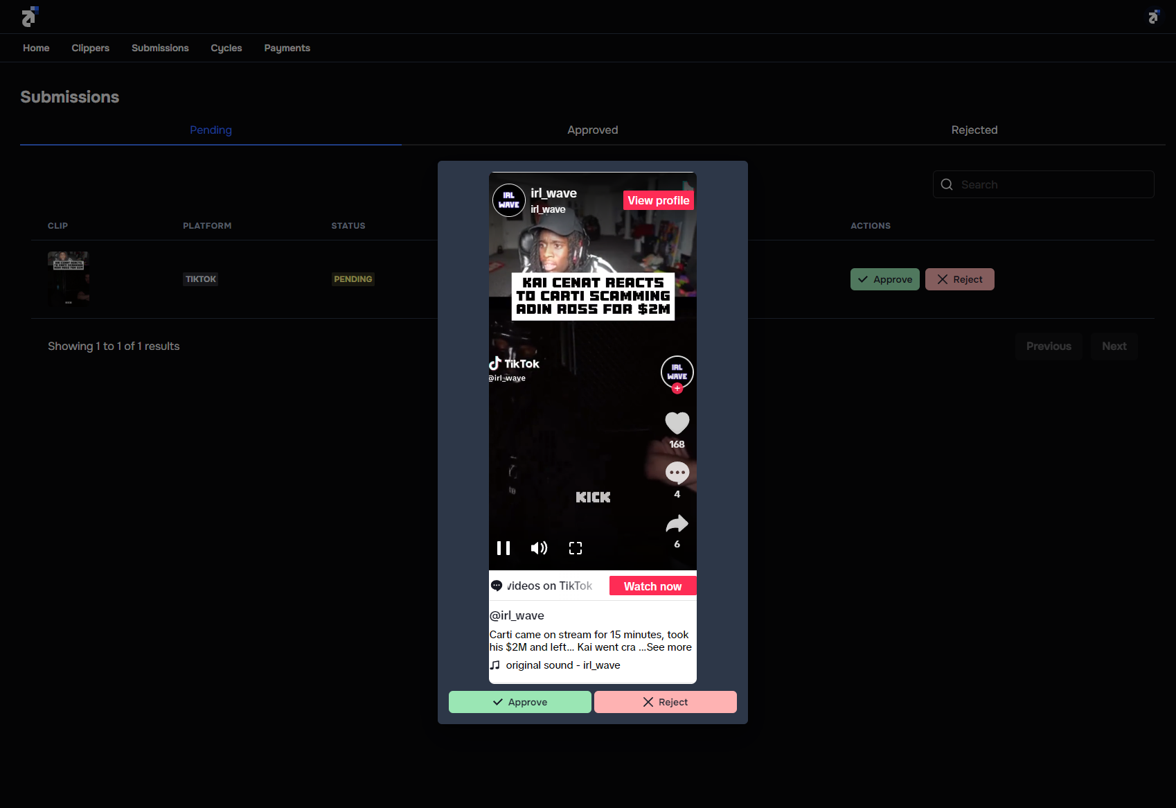 To review a submission, click on the submission thumbnail. A pop-up modal will appear and allow you to watch the submission.