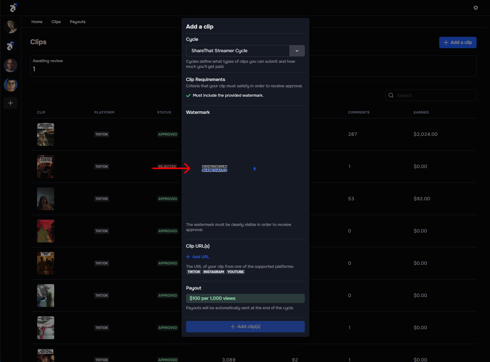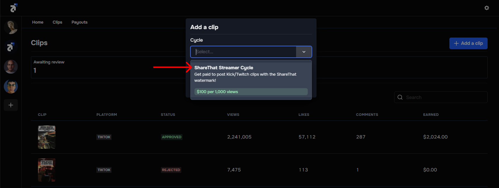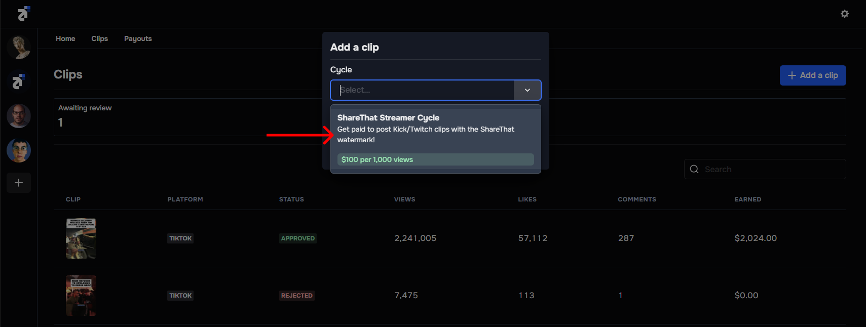 - Pay per view: Pay clip creators based on the number of views generated during a cycle. E.g. Pay $30 for every 100k views generated on TikTok. Pay-per-view is the best mode for attracting top-tier clip creators.